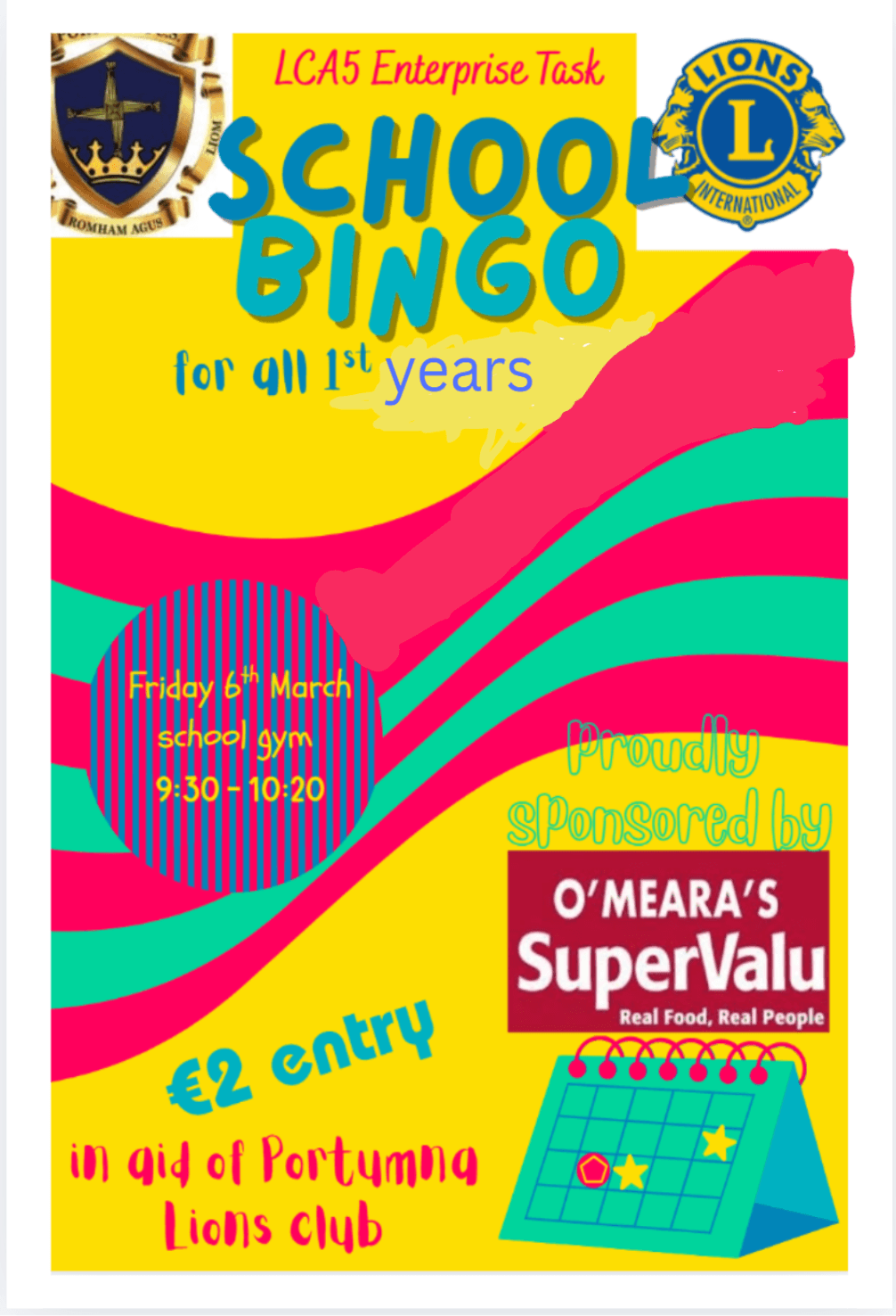 LCA 5 are hosting a fun bingo game for 1st year student this Friday morning to raise money for Portumna Lions Club This will be a great opportunity for students to learn about Bingo, have some fun and and win some small prizes.